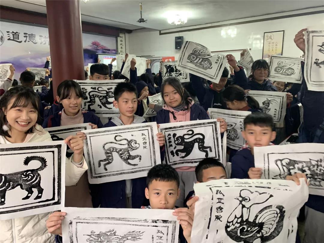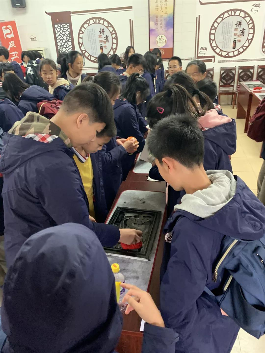 再看看,生肖拓印現場的同學們也非常認真。在講解員的精心講解后,同學們用小盆中的刷子蘸取墨汁在拓板上從上到下的刷。最后用宣紙覆蓋在上面,再用小的紅色物品輕輕的按壓,形成成品。看著一張張親手拓印的生肖畫,同學們可開心了!據說, 還有同學專門為自己父母拓印了生肖圖呢!