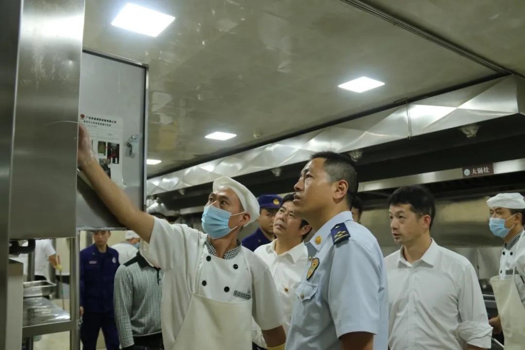 隨后,消防救援大隊一行來到學校食堂后廚,抽查食堂員工消防知識,并現場指導工作人員使用消防設備。
