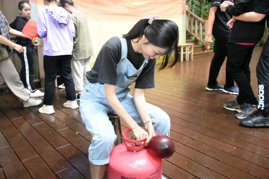 同學們隔著一米半圍成圈看著老師“危險”操作——打氫氣球,正喜悅第一個氣球終于慢慢膨脹起來了,轉眼間便搖搖擺擺地飄上了天空,引來一片唏噓,接二連三地,氣球仿佛都通了氣似的,比起被束縛,更向往無邊無際的藍天。小伙伴們只得小心翼翼地把氣球接到手上,轉圈,打結,系繩,綁石頭,同學們分工合作。不一會兒,舞臺布滿了五彩斑斕的氫氣球,我們創造出了斑斕絢麗的舞臺,成就感油然而生。