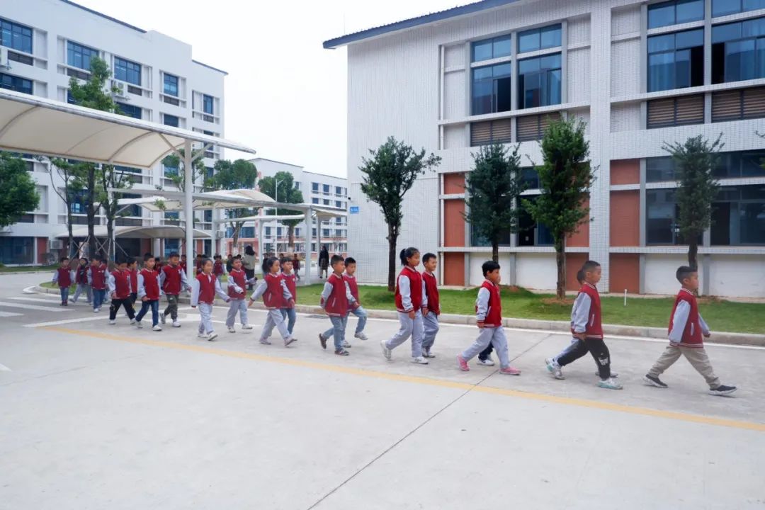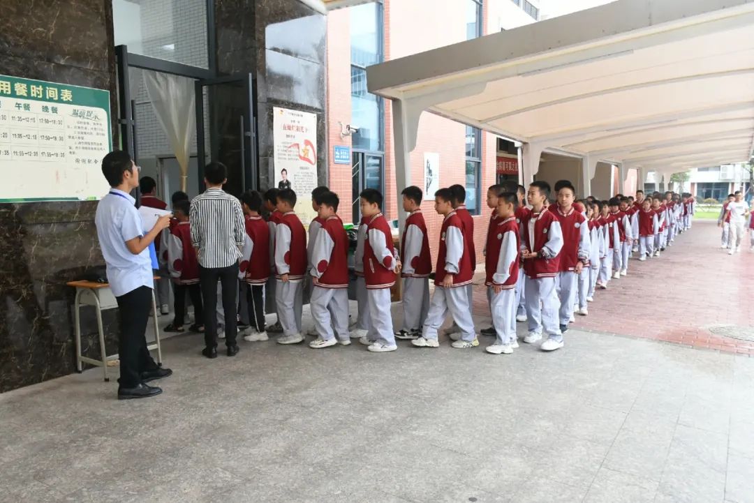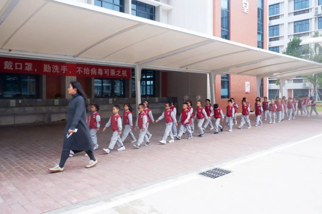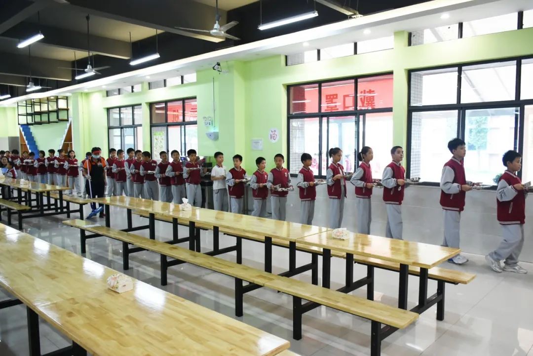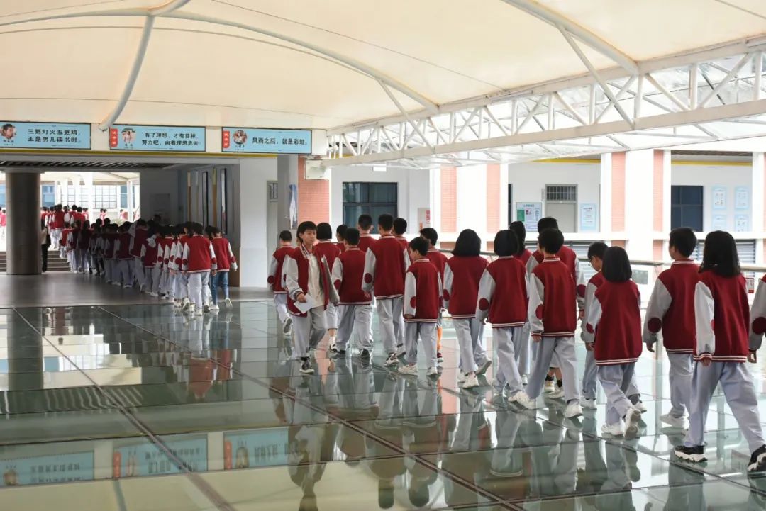 每到時間,學生自覺排成整齊的隊伍,按照規定的路線向餐廳出發!這整齊的路隊就是他們的招牌,這有力的步伐就是他們的精神面貌!