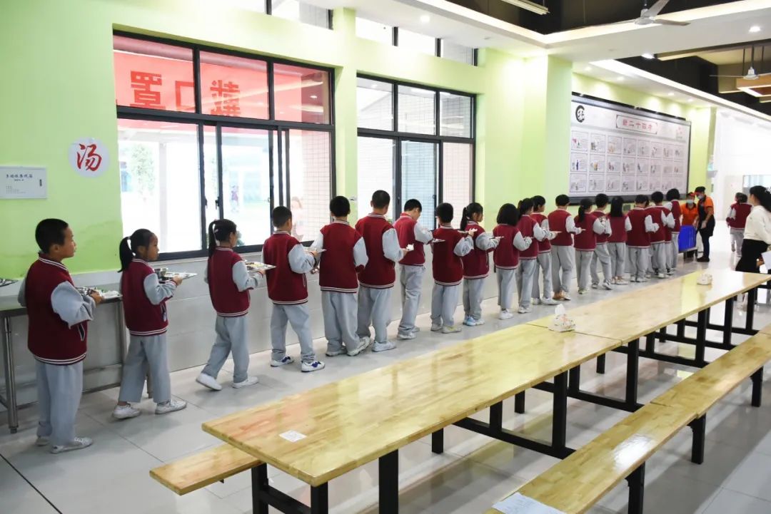 下課鈴響,學生安靜有序地排隊洗手,保持個人衛生很重要。整隊遵循“快、靜、齊”三個要求,有序地向餐廳走去!