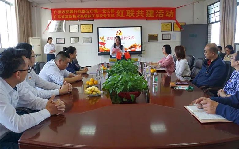 11月23日下午4點(diǎn),在學(xué)校中堅(jiān)樓會(huì)議室,我校黨支部與廣州農(nóng)商銀行花都支行第一黨支部舉行“紅聯(lián)共建”簽約儀式,開展黨建共建活動(dòng)。學(xué)校黨支部書記陳燕清、副書記張娟、高新教育集團(tuán)董事簡(jiǎn)菘波、高新技校校長(zhǎng)助理孫建華,廣州農(nóng)商銀行花都支行黨委書記黃少珊、廣州農(nóng)商銀行花都支行第一黨支部書記崔莉莉、廣州農(nóng)商銀行花都支行公司業(yè)務(wù)三部團(tuán)隊(duì)長(zhǎng)鞏軼斐,以及雙方黨支部其他支委委員、黨員代表一起參加了活動(dòng)。