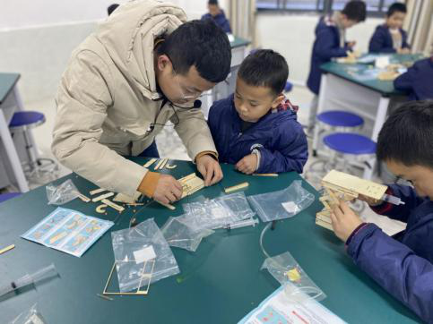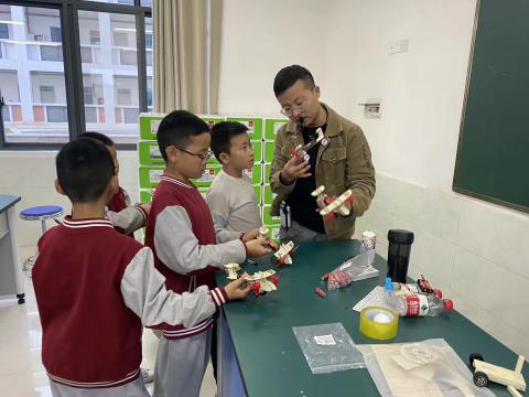 有一些語數(shù)課上的“笨孩子”,在科學(xué)大課堂上非?;钴S,在完成任務(wù)的基礎(chǔ)上還樂于幫助其他同學(xué),課后也會常常找柴老師詢問關(guān)于制作方面的問題。除了講授每個小制作的原理,教學(xué)生組裝最基礎(chǔ)的零件,柴老師還別出心裁,將原來滑翔機(jī)上的零件拆下來改造成了水上自由漂浮的小船。這讓學(xué)生對這些小制作更感興趣,原來只要簡單地轉(zhuǎn)化一下思維,稍加改動,就可以變成新的小玩意兒。